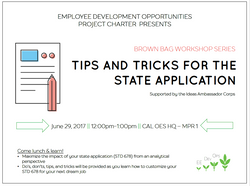 These are workshop flyers that I created for California Governor's Office of Emergency Services' (Cal OES) Employee Development Opportunities Project Charter (EE Dev Ops). Each one was created using Powerpoint and I chose fonts and colors that stand out when they are printed.